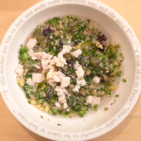 ささみ6g 納豆2.1g さつま芋15g ブルーベリー6g きゃべつ5g ブロッコリ5g もやし5g 小松菜5g 小岩井10g 亜麻仁油1g 湯80cc ebi1T bio2/3g VC0.2g Ca0.2g Zn1/8T のこぎりやし1cap