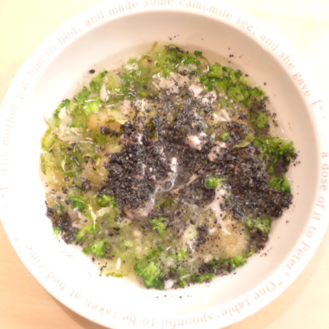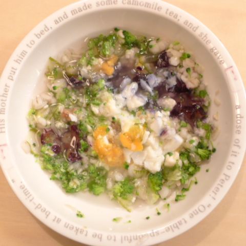 ぶり7g じゃがいも15g ブルーベリー6g きゃべつ5g ブロッコリ5g おくら5g 小松菜6g 昆布0.05g 黒ごま3g 小岩井10g 湯80cc ebi1T bio2/3g VC0.2g Ca0.2g のこぎりやし1cap