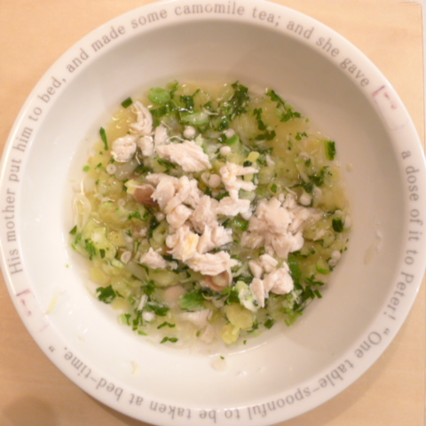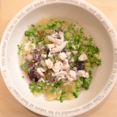 ささみ6g 豆腐10g さつま芋15g ブルーベリー6g きゃべつ6g ブロッコリ5g もやし5g おくら5g 亜麻仁油1g 小岩井10g 湯80cc ebi1T bio2/3g VC0.2g Ca0.2g のこぎりやし1cap