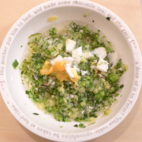 半熟卵(卵白7g 卵黄4g ) 納豆2.8g さつま芋15g ブルーベリー6g きゃべつ5g ブロッコリ5g もやし5g 小松菜5g おくら5g 昆布0.05g 小岩井10g 湯100cc ebi1T bio2/3g VC0.3g Ca0.2g のこぎりやし1cap