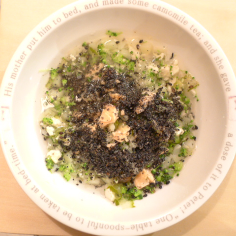 鮭7g 豆腐10g じゃが芋15g きゃべつ5g ブロッコリ5g もやし5g 昆布0.05g 黒ごま3g 小岩井20g 湯80cc bio2/3g VC0.2g Ca0.2g Zn1/10T のこぎりやし1cap