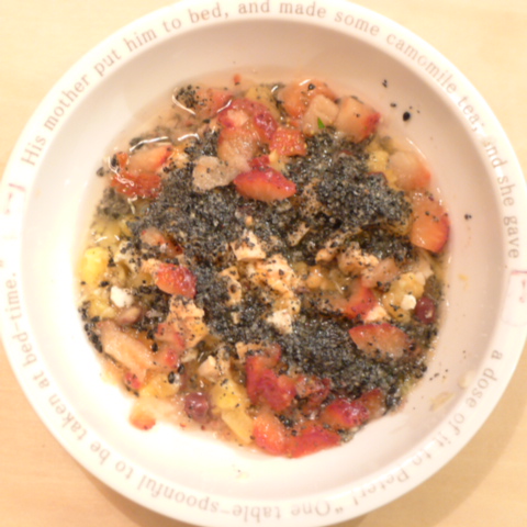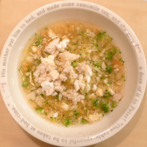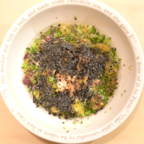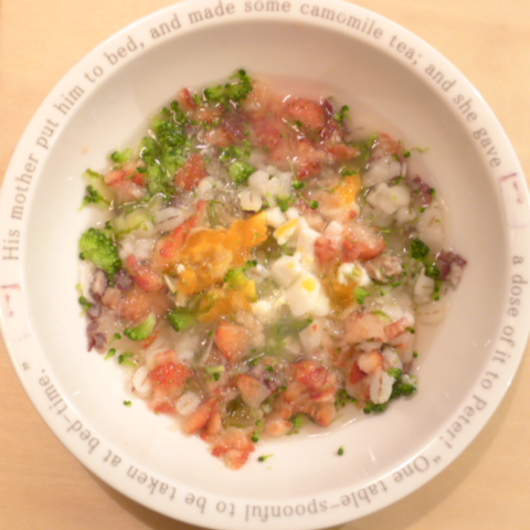鮭7g 小豆5g 安納芋15g きゃべつ5g ブロッコリ5g 人参5g 昆布0.05g 黒ごま3g 小岩井20g 湯90cc ebi1T bio2/3g VC0.2g Ca0.2g