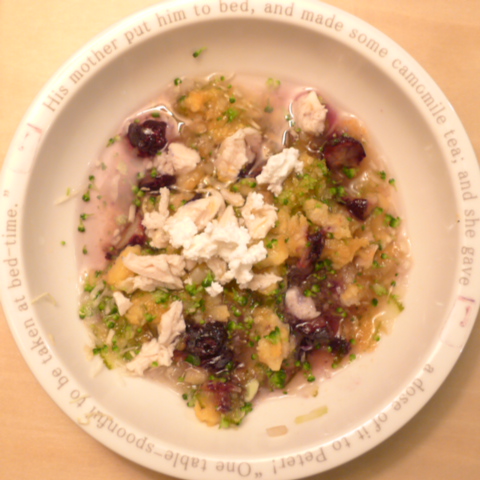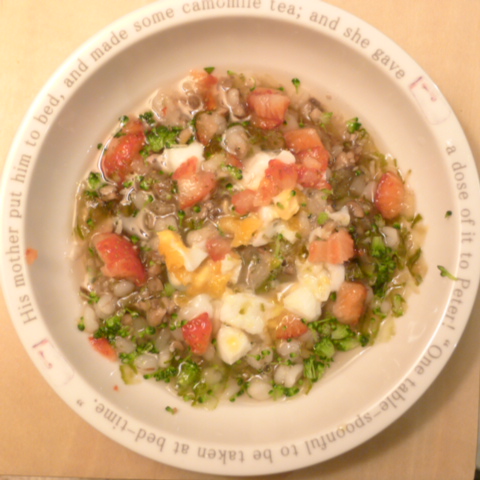 半熟卵10g(卵白6.5g 卵黄3.5g) 押麦15g 苺8g きゃべつ5g ブロッコリ5g もやし5g マッシュ茸10g(茸5g 出汁5g) 昆布0.1g 亜麻仁油1g 小岩井20g 湯80cc