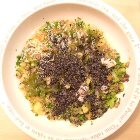 あじ8g 豆腐10g 芋15g きゃべつ5g ブロッコリ5g 小松菜5g 人参5g マッシュ茸6g 昆布0.05g 黒ごま3g 小岩井20g 湯100cc りんご20g bio2/3g