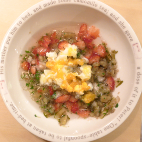 卵12g(卵白8g 卵黄4g)芋15g きゃべつ5g ブロッコリ芽5g 舞茸出汁10g 苺6g 昆布0.05g カッテージ3.5g 小岩井20g 湯40cc ebi1T bio2/3g VC0.2g Ca0.2g
