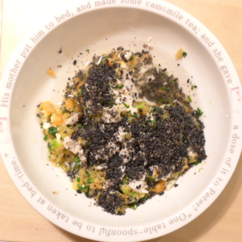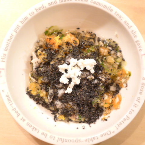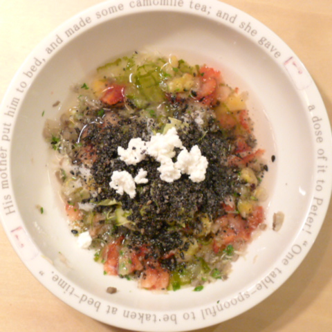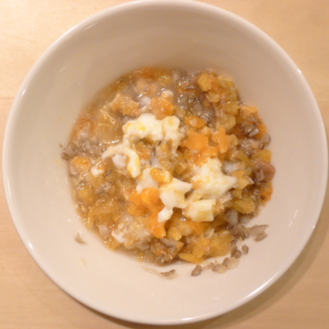 さわら8.5g 納豆2.8g 安納芋15g きゃべつ8g 人参6g ブロッコリ芽4.5g 昆布0.05g 黒ごま2g カッテージ2g 小岩井-g ebi1T bio2/3g Ca0.2g