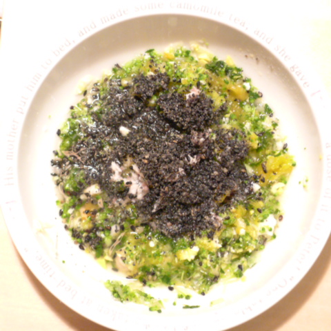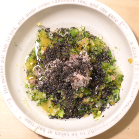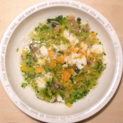 鮭8g 豆腐10g 安納芋15g 紫きゃべつ6g ブロッコリ5g 小松菜5g 南瓜8g 舞茸の出汁2g 黒ごま3g カッテージ3g小岩井20g 湯50cc ebi1T bio1g VC0.3g Ca0.2g