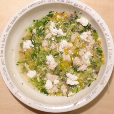 ささみ7g 豆腐10g 安納芋15g 紫きゃべつ5g ブロッコリ5g 小松菜5g 南瓜10g 昆布0.1g 亜麻仁油1g カッテージ5g 小岩井20g 湯80cc ebi1T bio2/3g VC0.2g Ca0.2g