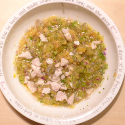 鶏(ムネ、モモ)6.5g 豆腐10g 安納芋15g きゃべつ5g ブロッコリ5g もやし5g 南瓜8g 舞茸5g 亜麻仁油1g ダノン20g 湯60cc ebi1T bio1g VC0.3g Ca0.2g