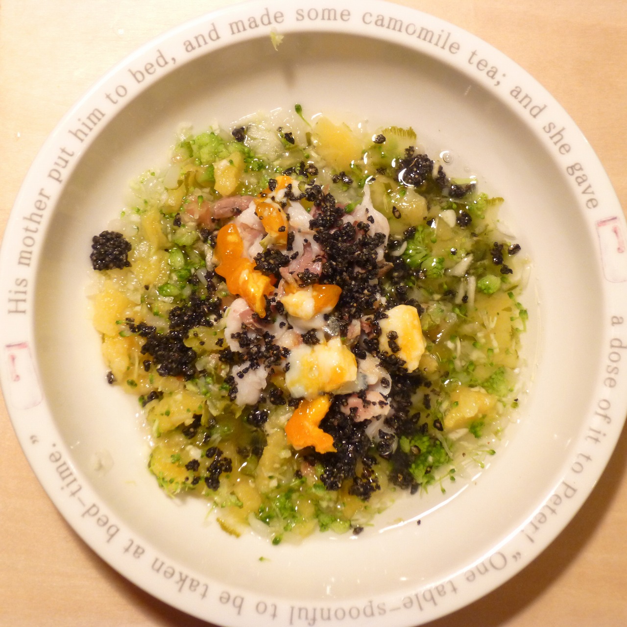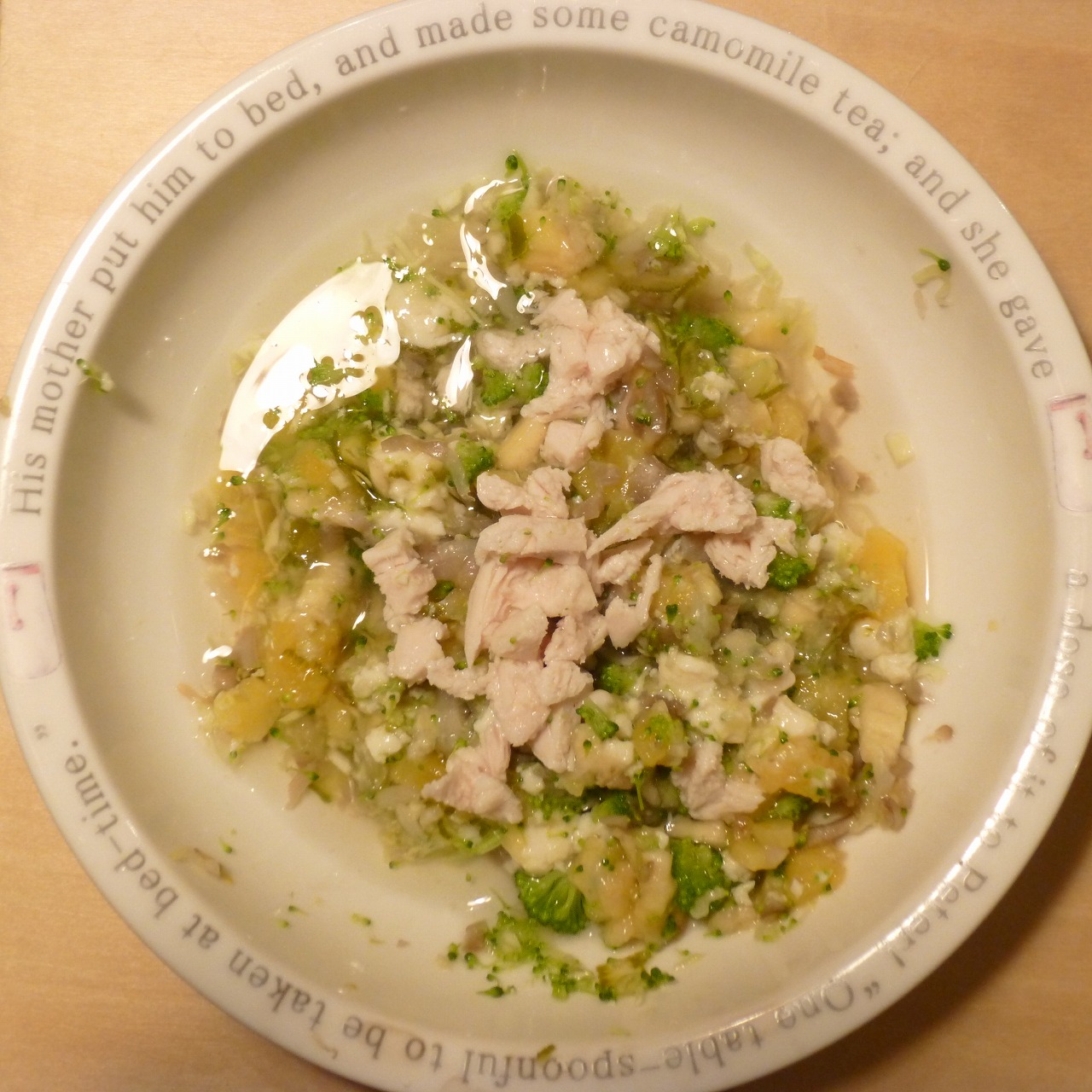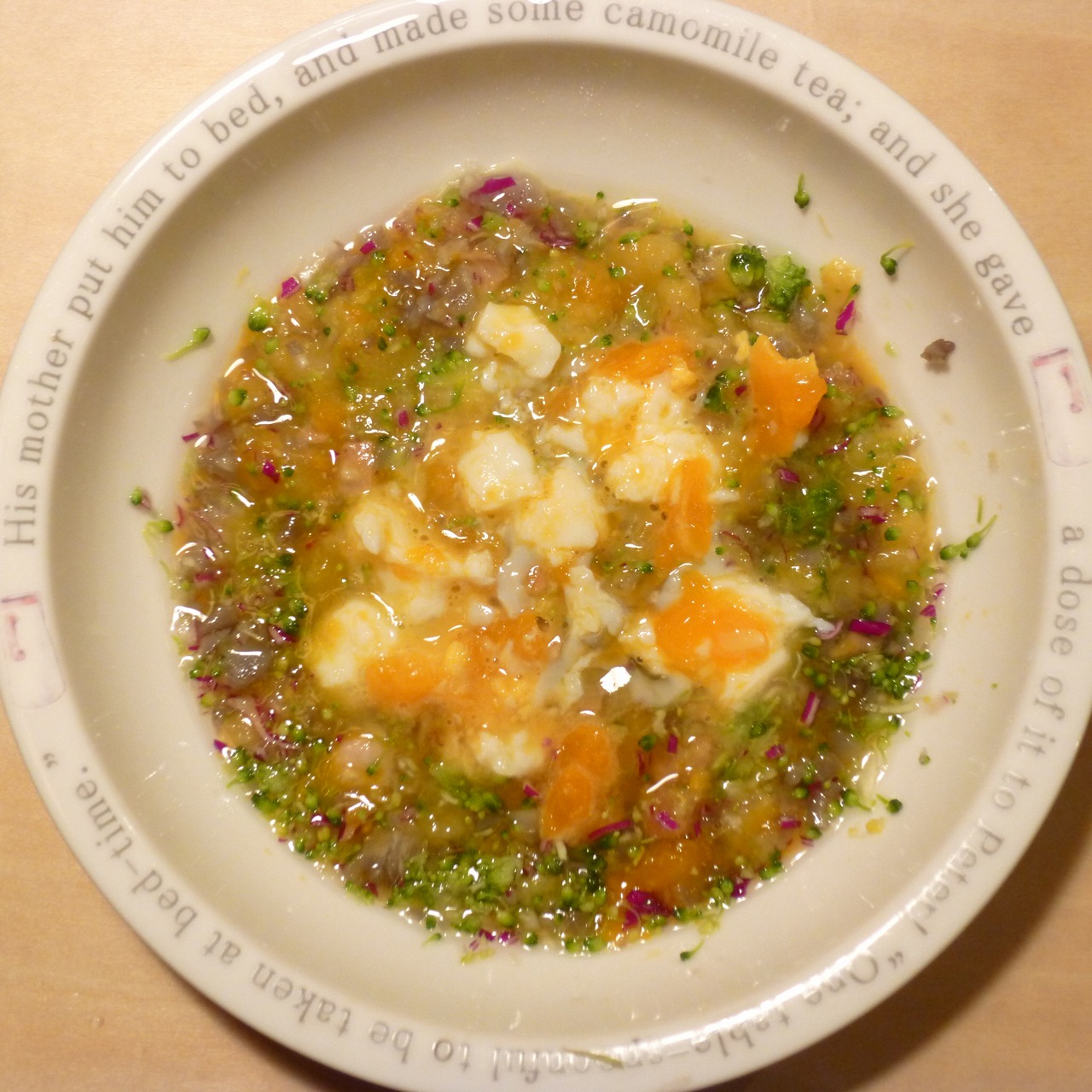 あじ8g 半熟卵6g 納豆3.5g 安納芋10g きゃべつ5g ブロッコリ5g もやし5g 昆布0.2g 黒ごま2g 小岩井20g ebi1T bio1g Ca0.2g Zn1/10T