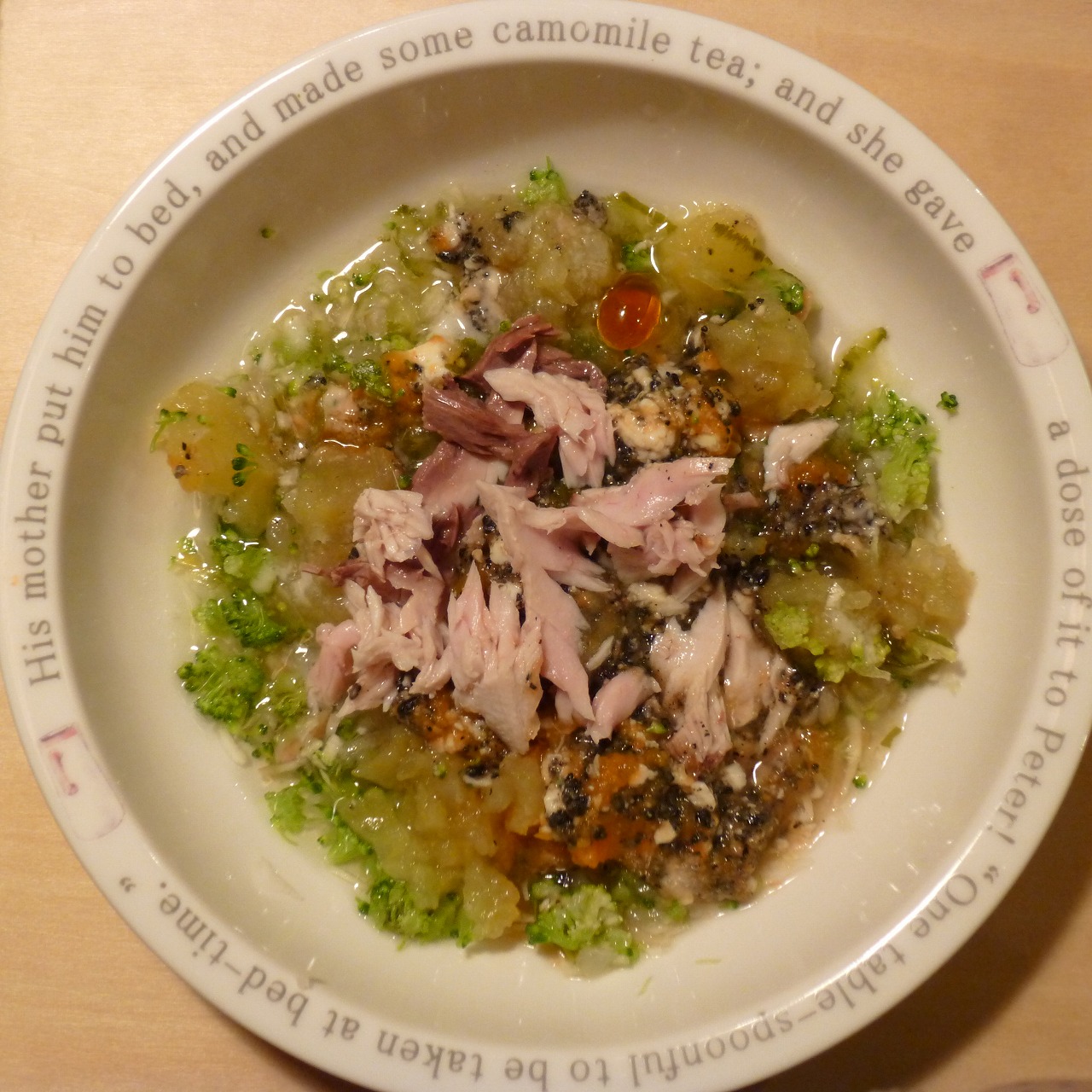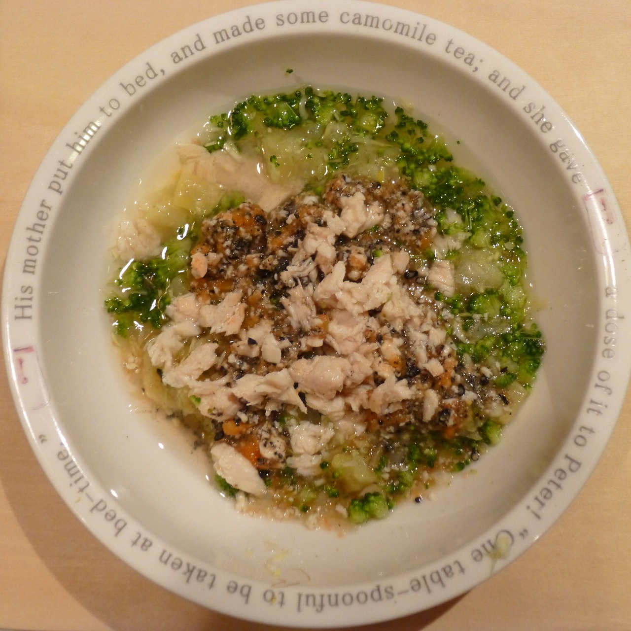 ささみ7g 豆腐11g 納豆3.5g きゃべつ6g 小松菜6g もやし6g 昆布1g バナナ12g カッテージ3g 小岩井20g ebi1T bio1g VC0.3g Zn1/10T (おやつに さつま芋10g 南瓜12g)