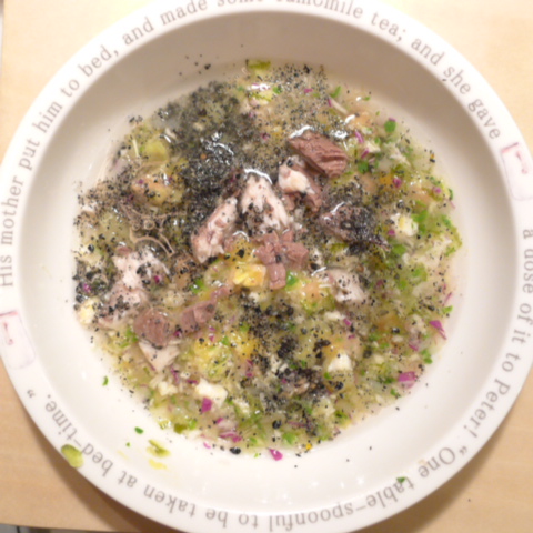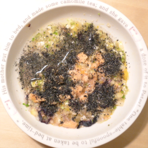 かわはぎ8g 豆腐15g 納豆3.5g 黒豆3.5g 小豆6g きゃべつ5.5g ブロッコリ芽5g もやし6g 南瓜11g 昆布1g 黒ごま2g カッテージ5g ダノン20g ebi1T bio3g VC0.2g Ca0.2g