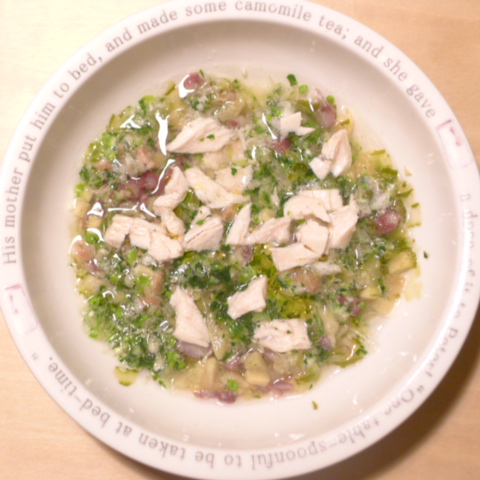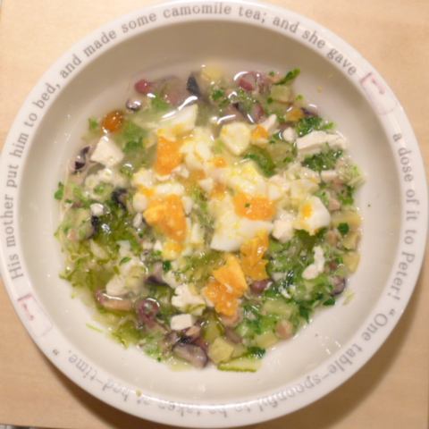 半熟卵10g ささみ7g 豆腐10g 黒豆5g 納豆3.5g さつま芋10g きゃべつ5g ブロッコリ芽5g 小松菜6g 昆布1g 亜麻仁油1g ダノン5g ebi1T bio3g VC0.2g