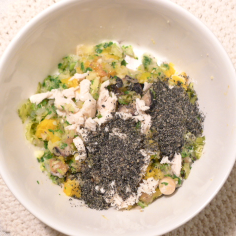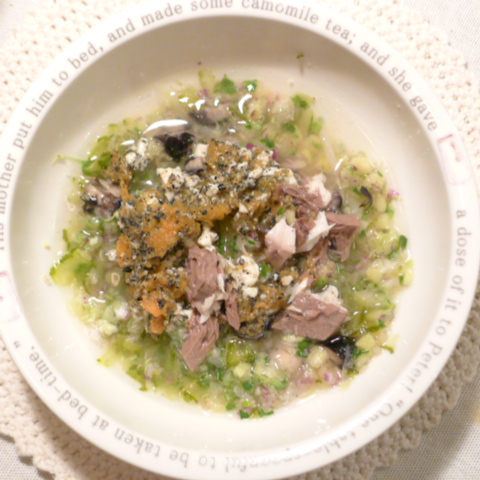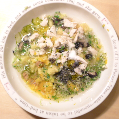 ぶり7g 豆腐10g 黒豆5.5g さつま芋10g きゃべつ6g ブロッコリ芽6g もやし6g 人参6g 昆布1g 黒ごま1.5g ダノン20g ebi1T bio3g VC0.2g Ca0.2g のこぎりやし1ヶ