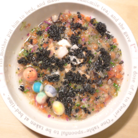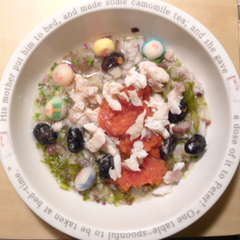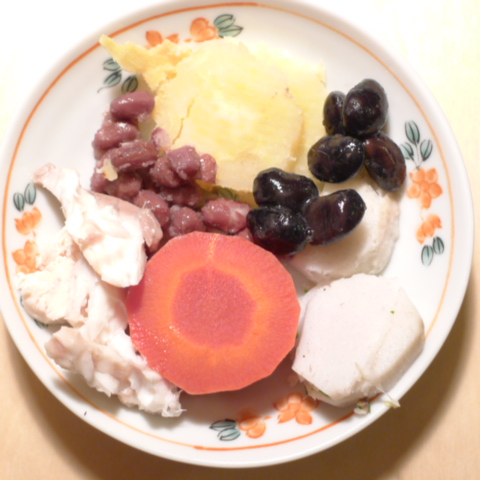 ぶり5g 鮭3.5g 黒豆6g 納豆3.5g (鳴門金時10gご飯の前に食べる)蜜芋10g 麩0.1g きゃべつ5.5g ブロッコリスプラウト5g 金時人参15g 昆布1g りんご15g 黒ごま3g ebi1T bio3g VC0.2g のこぎりやし1cap