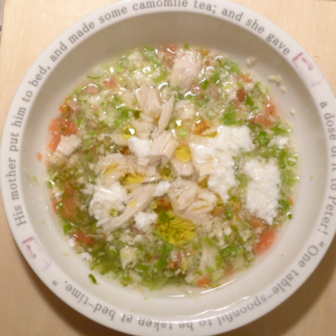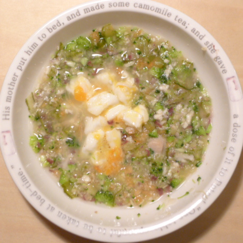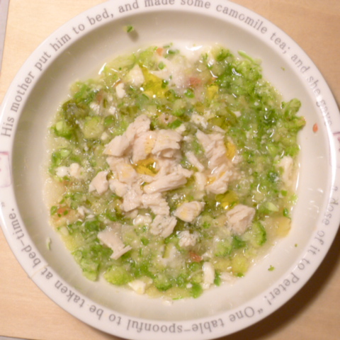 夕ご飯 ささみ6.5g 豆腐10g 芋10g きゃべつ6g ブロッコリ7g 三度豆5g ピーマン5g プチトマト5g 昆布1g 亜麻仁油1g ダノン20g ebi1T bio3g VC0.1g Ca0.1g