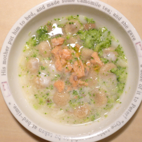 h/d10.2g 湯70cc 鮭6.5g 納豆3.5g ブロッコリ6g じゃがいも10g ブロッコリ5g 亜麻仁油0.5g ダノン10g eb1T bio3g Vc0.5g Ca0.15g のこぎりやし1個