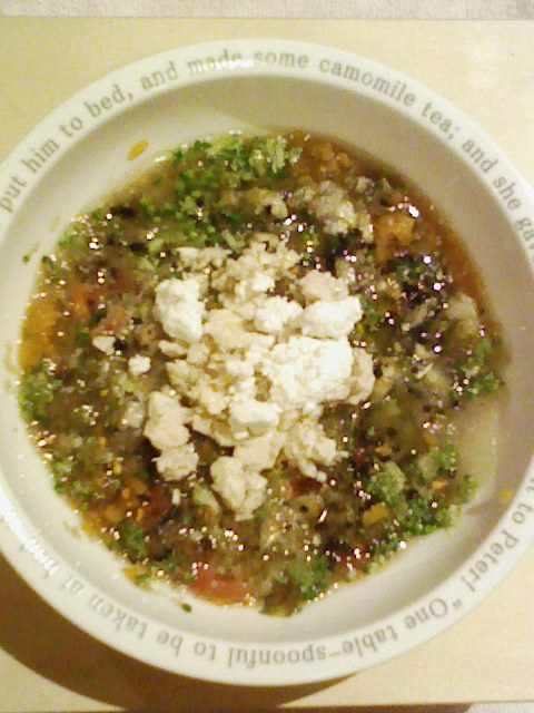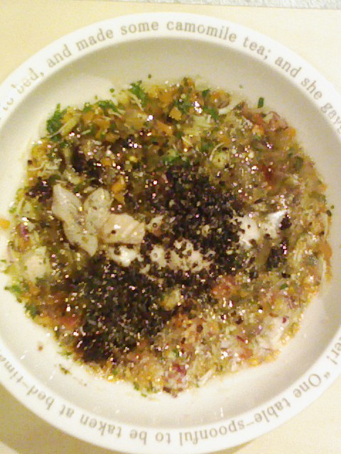 あじ8g 紫きゃべつ5g なす8g 人参8g 紫蘇1g 中トマト7g マッシュ茸7g 鳴門金時8g 昆布0.3g ひじき0.5g 黒ごま2.5g 湯100cc 小岩井20g ebi1T bio2g Vc0.2g Ca0.15g Zn1/10 のこぎりやし1T 鹿肉五膳1T 8.5割食べる。