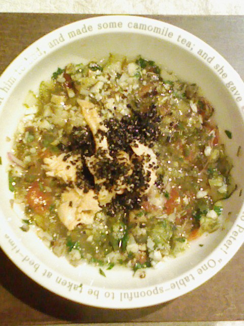 鮭8g 納豆3.5g キャベツ5g なす10g 紫蘇2g 中トマト20g マッシュ茸8g 干椎茸1g 鳴門金時8g 昆布0.3g 黒ごま3g 湯80cc 小岩井20g ebi1T bio2g Vc0.2g Ca0.15g Zn1/10