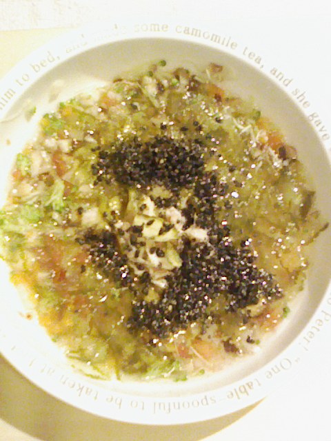 かつお8g 納豆3.5g キャベツ5g きゅうり8g なす10g 人参8g プチトマト20g マッシュルーム5g 舞茸6g さつま芋10g 昆布0.3g ひじき0.5g 黒ごま3g 湯100cc カッテージ3g 小岩井20g ebi bio2g Vc0.2g Ca0.2g Zn1/10 のこぎりやし