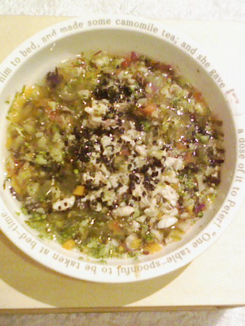 ささみ7g 納豆3.5g キャベツ5g きゅうり5g 大根6g ブロッコリ5g なす6g 人参4.5g プチトマト13g マッシュ茸5g 椎茸5g さつま芋8g 昆布0.3g 亜麻仁油1g 湯100cc カッテージ3g 小岩井20g ebi bio2g Vc0.2g Ca0.15g Zn1/10