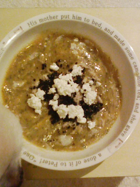 ささみ4.5g 鰺2.5g 青梗菜7g 人参8g マッシュ茸8g 紫蘇1.2g 昆布0.3g 亜麻仁油1.5g 黒ごま1.5g カッテージ2g 小岩井15g 湯 ebi1錠 bio2g Ca0.1g Zn0.1 ノコギリ VCE0.3g 酵素3g