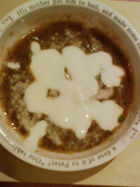 鮭4g ささみ4g 納豆5g パセリ1.5g キャベツ5g 人参8g 舞茸の出汁5g プチトマト15g 昆布0.3g 黒ごま2g 亜麻仁油1g カッテージ3g 小岩井20g 湯 ebi1錠 bio2g Ca0.1g 酵素3g