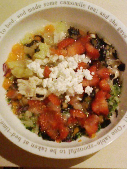 あじ7.5g 紫蘇0.2g 苺10g 人参の葉3g ブロッコリ3g 紫キャベツ5g マッシュルーム10g さつまいも12g プチトマト15g カテージ3g 黒ごま3g 小岩井20g 湯 ebios1 bio2g Zn1/10 Ca0.2g