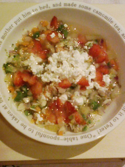 鮭3.5g まぐろ3.5g 紫蘇0.9g 隠元5g 人参8g ブロッコリ5g キャベツ5g 舞茸5g さつまいも12g プチトマト10g カテージ3g 黒ごま2g 小岩井20g 湯 ebios1 bio2g Zn1/10 Ca0.2g