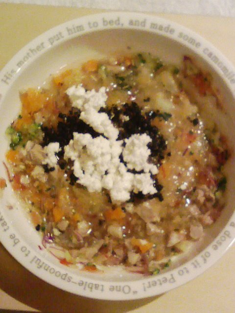 かつお8g 納豆3g りんご20g 紫蘇1g 人参9g ブロッコリ5g キャベツ5g マッシュルーム8g さつまいも10g プチトマト15g カテージ3g 黒ごま3g 湯 ebi1 bio2g Zn1/10 Ca0.2g