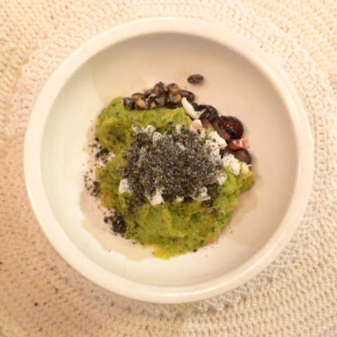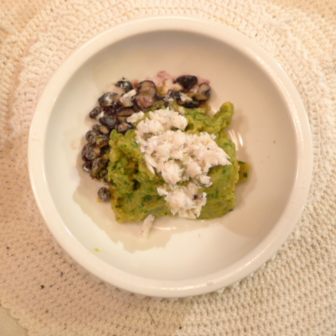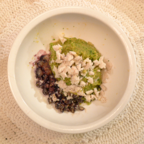 【夕ご飯】ぶり(愛媛養殖)8g 芋15g 南瓜12g トマト27g 春きゃべつ5g ブロッコリ5g 小松菜5g スナップえんどう5g 亜麻仁油0.3g ブルーベリー5g 黒豆納豆3g 俊粉1g ebi2T bio1.5g EsC0.5g Cilantro1g 湯50g