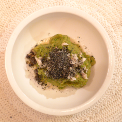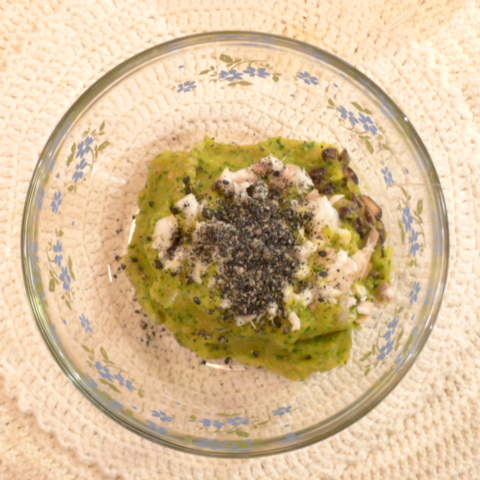 【夕ご飯】あじ(長崎 塩辛い)8g 芋15g 南瓜12g トマト30g 春きゃべつ5g ブロッコリ6g 小松菜5g スナップえんどう5g マッシュルーム出汁5g 黒ごま1g 亜麻仁油0.2g ebi2T bio1.5g EsC0.5g Cilantro0.8g 黒豆納豆1.5g 黒粉0.5g 湯80g