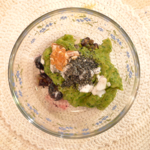 【夕ご飯】鯛(愛媛養殖)8g 芋17g 南瓜13g トマト28g 春きゃべつ5g 小松菜5g ほうれん草5g 黒ごま1g 亜麻仁油0.3g ebi2T bio1.5g Es-C0.5g ブルーベリー5g 黒豆納豆3g 市田柿2.5g 俊粉0.3g 湯40g