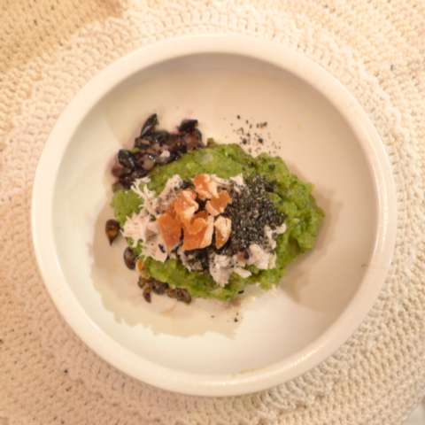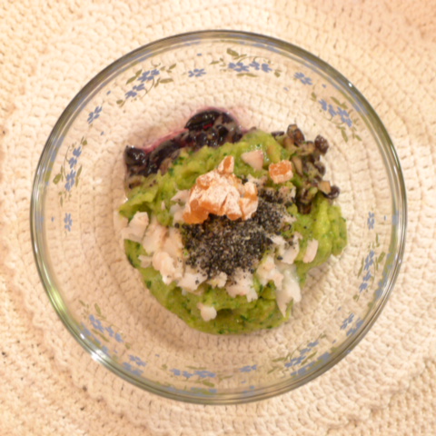 【夕ご飯】ご飯あじ(鳥取)8g 芋16g 南瓜12g トマト26g 春きゃべつ6g 小松菜6g スナップえんどう6g 黒ごま1.2g 亜麻仁油0.3g ebi2T bio1.5g Es-C0.5g Cillantro1g ブルーベリー5g 黒豆納豆2.5g 市田柿2g 俊粉1g 湯45g