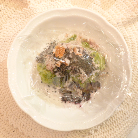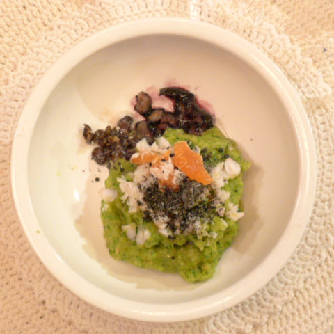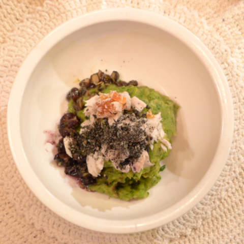 【夕ご飯】ほっけ(北海道)8.5g 芋16g 南瓜13g トマト25g 春きゃべつ6g ほうれん草6g スナップえんどう6g 黒ごま1g 亜麻仁油0.3g ebi2T bio1.5g Es-C0.5g Cillantro0.5g ブルーベリー5g 黒豆納豆3g 市田柿2g 俊粉1g 湯45g