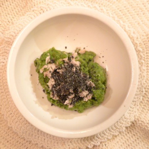 【夕ご飯】ばう玉子(渚おうはん)白10g+黄4g 芋16g トマト25g 舞茸5g きゃべつ5g ブロッコリ5g 小松菜5g 寒縮ほうれん草5g スナップえんどう5g 亜麻仁油0.3g ebi2T bio1.5g Es-C0.5g Cilantro0.8g 黒豆納豆3g ブルーベリー2g 黒千石きな粉2g 湯50g
