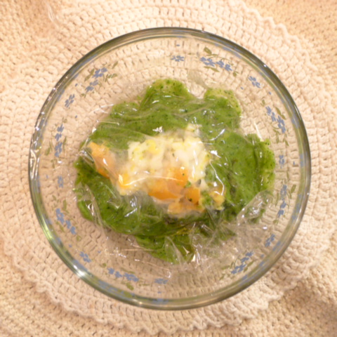 【夕ご飯】ばう玉子(素王卵)白8.5g+黄5g 芋16g トマト25g 舞茸4g+舞茸出汁5g きゃべつ6g ブロッコリ5g 小松菜5g 寒縮ほうれん草5g スナップえんどう5g 亜麻仁油0.4g ebi2T bio1.5g Es-C0.5g Cilantro0.8g 黒豆納豆3.5g 黒千石きな粉0.8g 湯50g