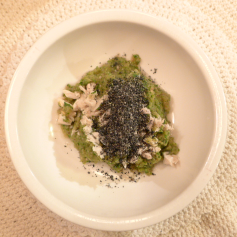【夕ご飯】ささみ(国産地鶏)8.8g 芋16g 南瓜(鹿児島)15g 舞茸5g トマト35g きゃべつ6g ブロッコリ8g 小松菜(福岡)5g おくら芽5g 亜麻仁油0.5g ebi2T bio1.5g EsterC0.4g ブルーベリー7.5g 黒豆納豆3.8g 黒千石きな粉1.8g 湯70g