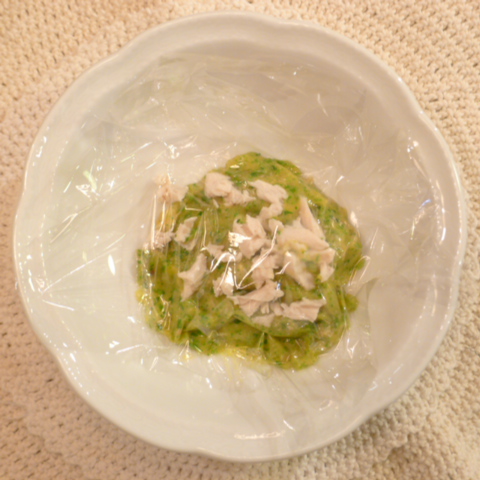 【夕ご飯】ささみ(四国南部地鶏)4.5g 野菜の半分量35g((安納芋15g 南瓜12g 舞茸5g トマト35g きゃべつ5g ブロッコリ5g 小松菜6g おくら6g)×1/2) 亜麻仁油0.1g ebi1T bio0.75g EsterC0.2g 六条麦茶30g
