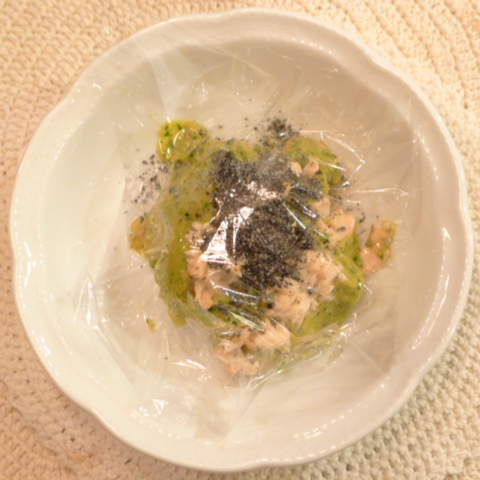 【夕ご飯】さわら(福岡)8g 芋15g 南瓜12g トマト35g きゃべつ5g ブロッコリ6g 小松菜5g おくら5g 舞茸5g 亜麻仁油0.7g 黒ごま1g 雪誉納豆3g ブルーベリー5g 六条麦茶70g ebi1T bio1g EsterC0.4g