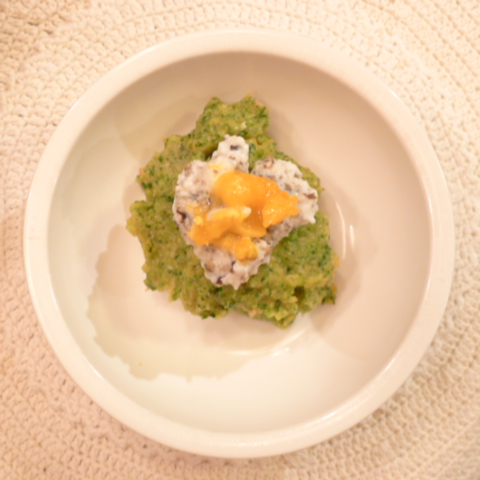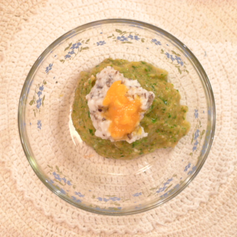 半熟卵(卵白10g 卵黄3g) 黒豆納豆2.5g 芋15g 南瓜12g トマト30g きゃべつ5g ブロッコリ5g 小松菜5g おくら5g ebi2T bio1.5g EsterC0.25g Cilantro1g 黒ごま1g 俊粉1g 湯50g