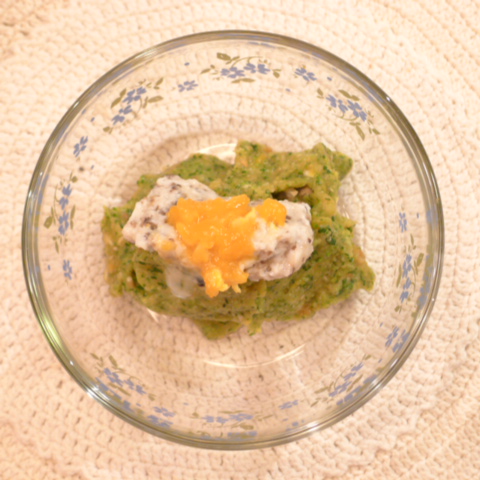 あじ(長崎)9g 黒豆納豆2.5g 芋15g 南瓜12g トマト33g きゃべつ5g ブロッコリ5g おくら5g ebi2T bio1.5g EsterC0.25g Cilantro1g 黒ごま2g 俊粉1g 湯50g