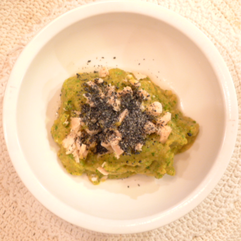 【夕ご飯】白鮭(北海道)8g 芋15g 南瓜11g トマト24g きゃべつ5g ブロッコリ5g 小松菜5g おくら3.5g 舞茸5g ebi1T bio1g plmC0.5g Ca0.2g 雪誉納豆3g ブルーベリー6g 六条麦茶60cc