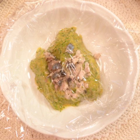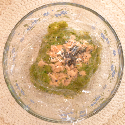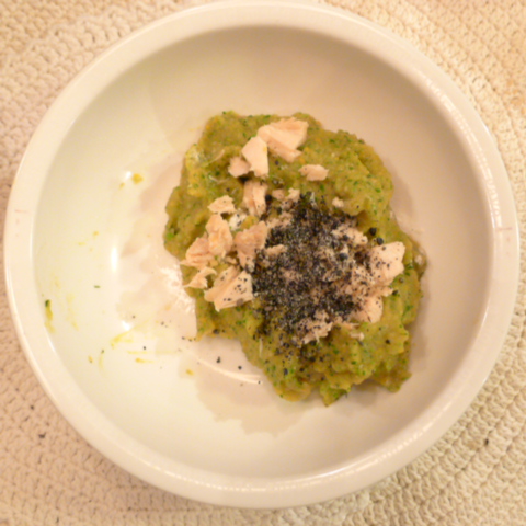 白鮭(北海道)8g 芋15g 南瓜12g トマト35g きゃべつ6g ブロッコリ芽3.5g おくら5g 舞茸5g 黒ごま0.5g 亜麻仁油0.5g ebi1T bio1g plmC0.5g Ca0.2g 雪誉納豆3.5g ブルーベリー5.7g 六条麦茶70cc
