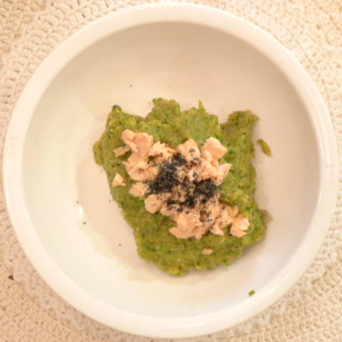 【夕ご飯】白鮭(北海道)8g 芋16g 南瓜15g トマト35g きゃべつ6g ブロッコリ芽2.5g 小松菜5g おくら3.5g 舞茸3.5g 黒ごま2g ebi1T bio1g plmC0.5g Ca0.2g